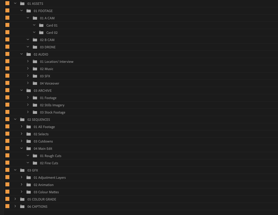 Editing is far easier and more pleasurable if you start the process in an organised way. Before you start cutting, collect all the audiovisual material that you have gathered and organize it into folders within the editing software. An example organizational structure is shown below: