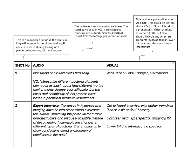 Once you have identified your target audience, assessed what visual material you have at your disposal, and decided on a format, you can start writing your script. It does not have to be a complicated document; we have provided a simple example format below. This is the document that will help you to clarify your thoughts, identify and explain your key messages, and act as a blueprint for the other phases of production.